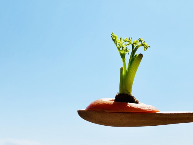 再生栽培(リボべジ)とは、にんじん・大根などのヘタや、豆苗や水菜などの野菜の根を栽培して、再度食すという方法です。