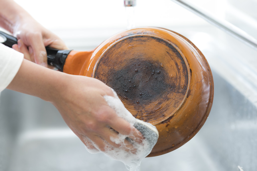 フライパンに水を入れて沸騰させ、スポンジなどを使い中性洗剤でしっかり洗い流します。